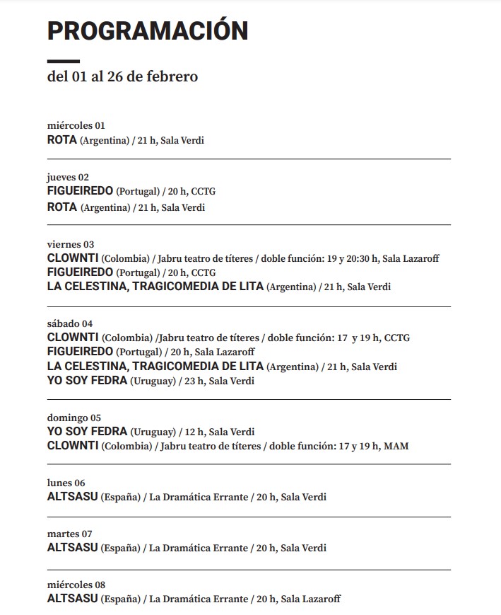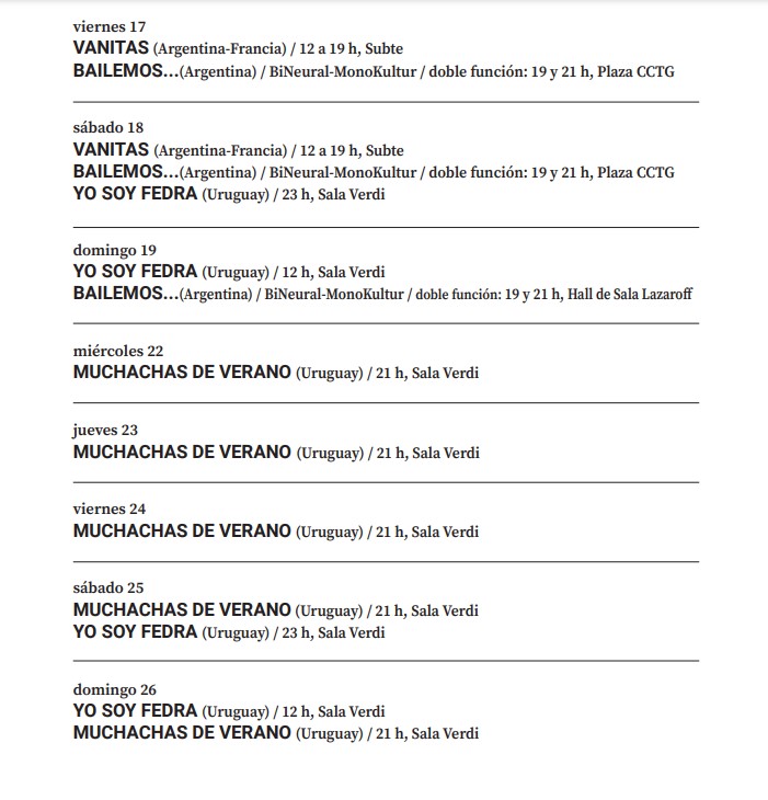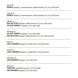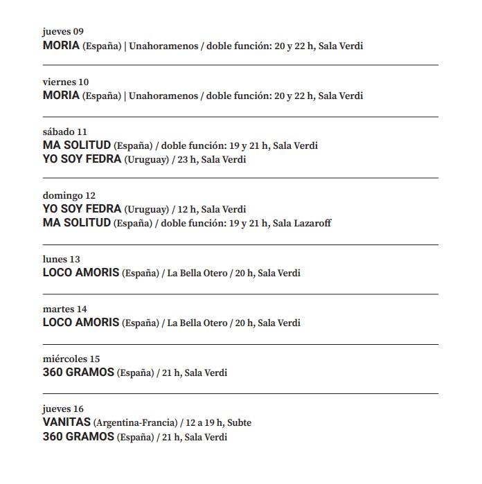 En esta edición se presentarán trece propuestas provenientes de Argentina, Colombia, España, Francia, Portugal y Uruguay; diversas entre sí, pero reivindicativas del hecho artístico como un universo de libertad sin concesiones.
