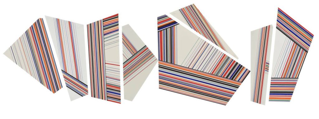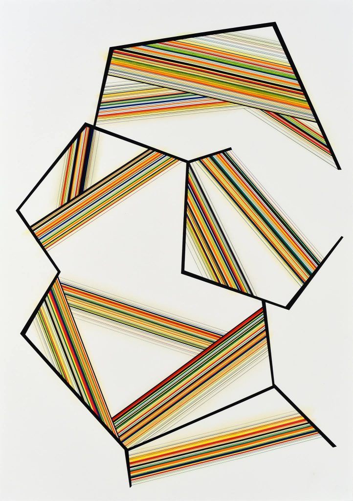 Desde hace una década, la obra del artista Miguel Ángel Giovanetti sitúa en el centro de su abstracción geométrica al pentágono. En un principio, esta figura apareció como parte integrante del dodecaedro y, luego, como unidad en sí misma vinculada a reflexiones provenientes de la filosofía en diálogo con las artes visuales, en ambos casos. Siempre dotándolo de libertad de movimiento y distintas apuestas compositivas de la mano de la pintura, el dibujo y el collage. Hasta llegar a los más recientes trabajos, donde este polígono regular parece estallar con la fuerza del Big Bang arrojando al espacio múltiples fragmentos que, a diferencia de otros momentos en su producción, adquieren la importancia de unidades autónomas constituidas por grupos de líneas rectas paralelas de variado cromatismo y armoniosos ritmos. Estos fragmentos de pentágonos privilegian el dibujo, realizado con bolígrafo con gel sobre papel, en la construcción pormenorizada de las líneas. La trama de intención perfeccionista cede su rigidez ante una diversidad de colores vibrantes y delicados con predominio de verdes, anaranjados, amarillos, rojos y azules. Las tonalidades se combinan también en función de los cambios de grosor de las rectas en las diferentes series. La potencia del fragmento –de raíz moderna y vanguardista– se asocia en la obra de Giovanetti, asimismo, con el diseño gráfico y textil. En su dinámica propuesta plástica, los dibujos pueden evocar imágenes fantásticas como las de pentagramas que no temen multiplicar su magnitud y romper con la horizontalidad o las de patterns en constante búsqueda y modulación de un destino. La figura recortada se eleva con sutileza sobre el fondo del papel en algunos conjuntos mientras que, en otros, se sumerge levemente al estar rodeada por un passepartout siguiendo su perímetro. En tanto, el movimiento prevalece en cada obra al proponer una dirección distinta en el espacio del papel (y del mundo). Dimensión de constante interés del artista, quien dentro de su extensa carrera ha mirado con especial atención al cubismo analítico y al futurismo, el movimiento se incrementa en los videos a través de fragmentos hacedores de rotaciones virtuales, las cuales juegan con la posibilidad de una completitud desplegada o condensada. Los dibujos de los videos son fotografías de los realizados a mano en las obras en papel, en una traslación que propone continuidad entre el mundo real y el virtual. Estas decisiones ligan a cada imagen con momentos pretéritos y futuros a partir de un acontecer de líneas y colores expansivo.