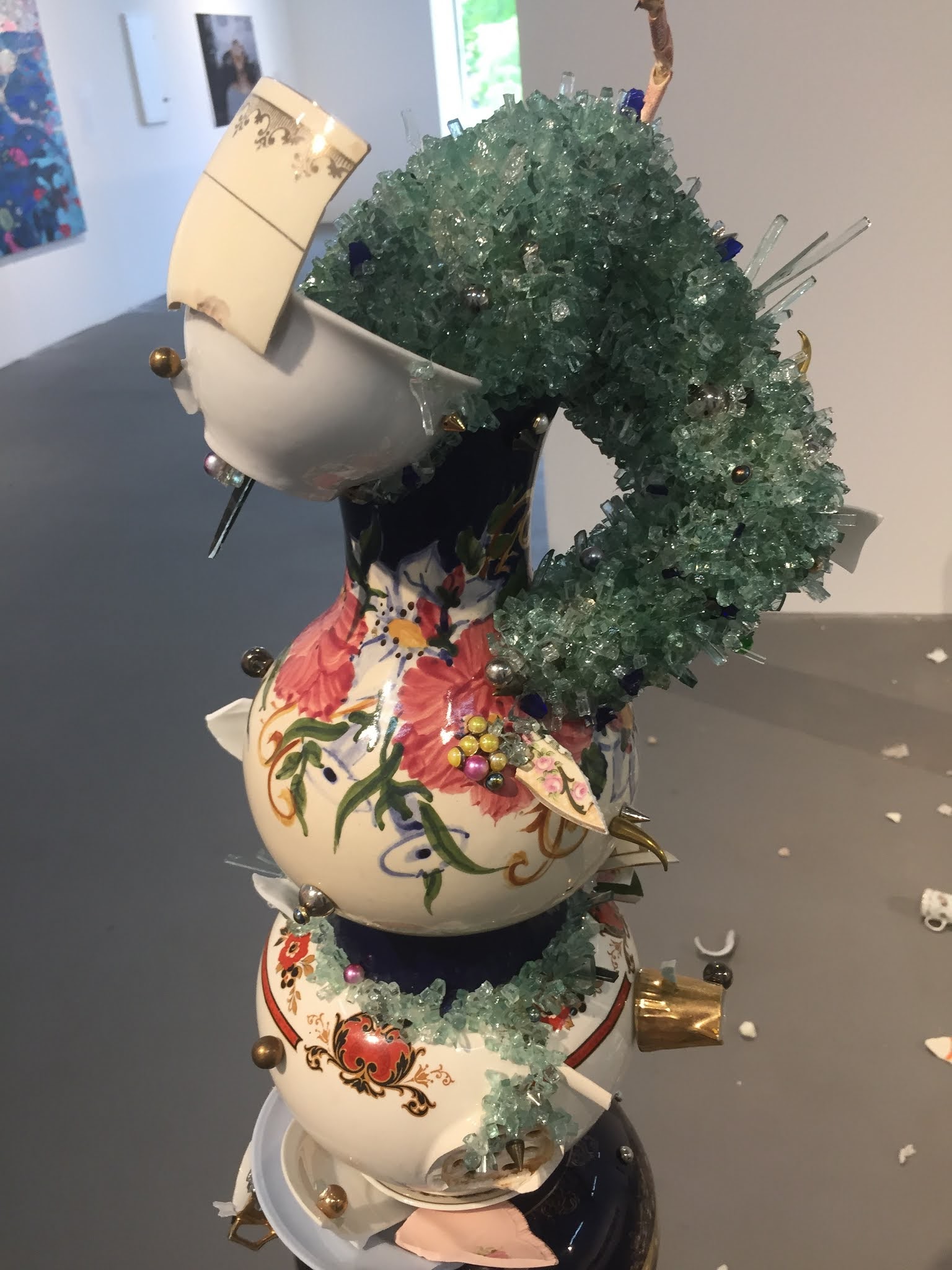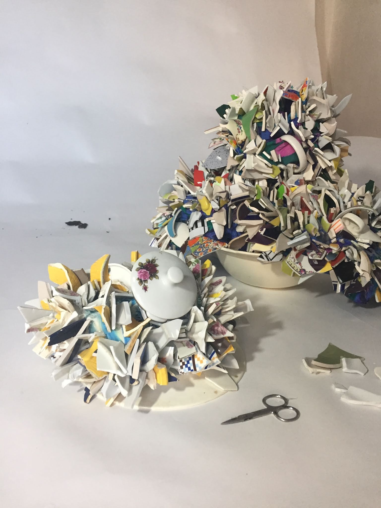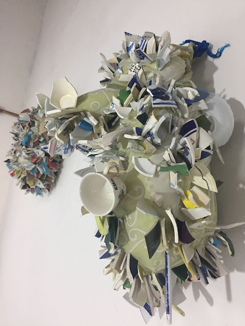 Objetos frágiles y destruidos pero no acabados. Y es que Guadalupe crea a partir de esos restos y les devuelve su vida mejor dicho los empodera. Llama la atención que a diferencia de otros artistas que usan trozos de cerámicas que los presentan cubriendo superficies y objetos a modo de mosaicos, Guadalupe los presenta de punta, erguidos, no solo devolviendoles la vida sino que generándoles una nueva concepción.
