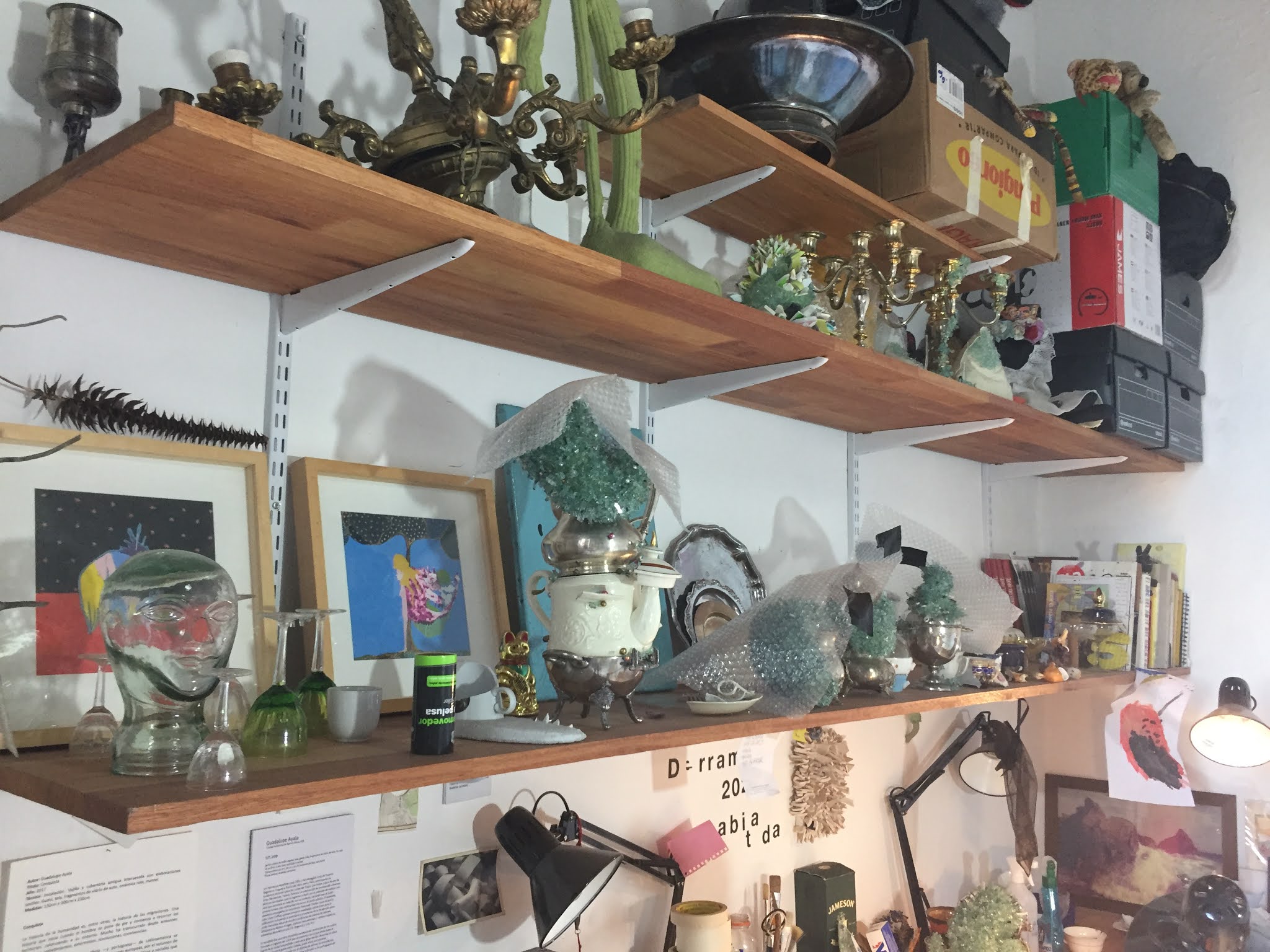 Allí, en una de ellas habita el taller de Guadalupe Ayala (Buenos Aires, 1976) quien se encarga de sacarle su máximo provecho, algo nada fácil teniendo en cuenta que el estudio no tiene ventanas y cuesta el ingreso de la luz natural. Pero Guadalupe lo resuelve con una estupenda ambientación e ingresar a su estudio es como llegar a un escenario teatral.