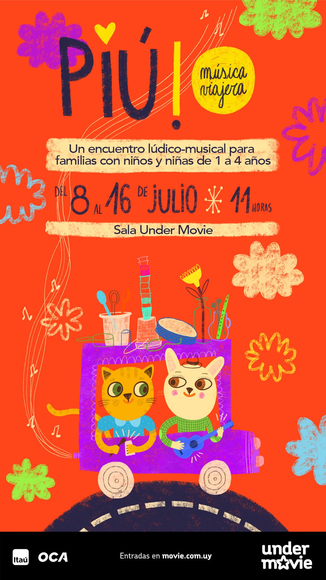 Piú nos invita a la Sala Undermovie a disfrutar de un viaje lúdico musical a través de canciones y objetos sonoros que se compartirán con todos los participantes (grandes y chicos) para jugar y tocar juntos a nivel de piso en una gran alfombra, que facilita la libertad de movimiento y la interacción por la cercanía.