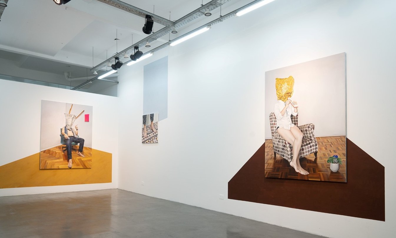 En la pared frente a los “Brunos” hay dos obras que guardan el mismo temperamento. La pintura saliéndose de su cauce natural para acentuar la importancia de su relación con el espacio. En “Pies”, una obra relativamente pequeña, de 80 centímetros por lado, puede verse un recorte perfecto de un piso de baldosas con alguien parado sobre él con los pantalones levemente levantados. Otra vez, la dotación técnica es impecable, el detalle de las marcas en los pies, la sombra del arco interno del pie sobre el piso y los pliegues del denim dan cuenta del tipo de pintor que es Camacho. El hombre de la pintura está parado a escasos centímetros de la pared, que actúa cómo límite a la pintura. Este límite es rebasado por un plano de color que se adueña de la pared de la sala proyectándose hacia el costado y hacia arriba. El gris de esa superficie no es el del cuadro, lo que provoca cierta dislocación en la mirada y lo vuelve todo menos obvio y previsible.