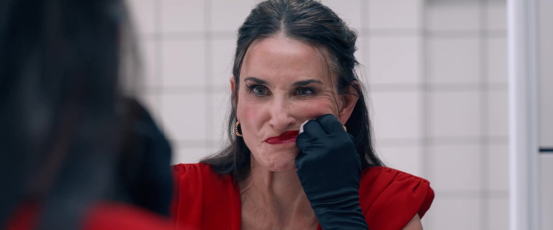 Sé que la dismorfia corporal y los problemas de percepción de nuestra imagen es algo que atraviesa a todos los géneros, pero tampoco vamos a pretender que las mujeres no hemos estado bajo ese lente por más tiempo. Y Coralie Fargeat no es nada sutil en mostrar este aspecto jugando con los contrastes entre Margaret Qualley siendo perfecta como una muñeca Barbie fresca y sonriente, y Demi Moore que no tiene miedo en mostrarse en sus ángulos menos favorables, no solamente por sus desnudos y primeros planos sino por su actuación donde realmente lo deja todo en la pantalla. Es un momento “full circle” teniendo en cuenta que a Moore siempre se la tendió a menospreciar bastante como actriz ya que lo que se destacaba siempre era su aspecto físico, y aquí demuestra que claramente siempre tuvo un potencial que nunca se había explotado como se merecía.
